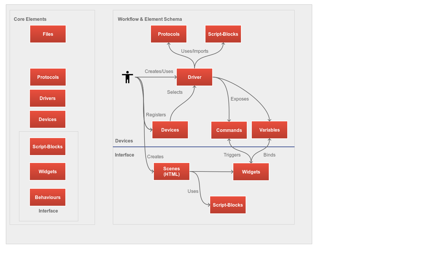 1. Author creates or uses "Drivers". "Drivers" are essentially the outlets for devices and expose functionality as "Commands" and if there is any data about the device, a driver exposes this as "Variables". For instance a command might be "Volume Up" and variable can be "Current Volume".