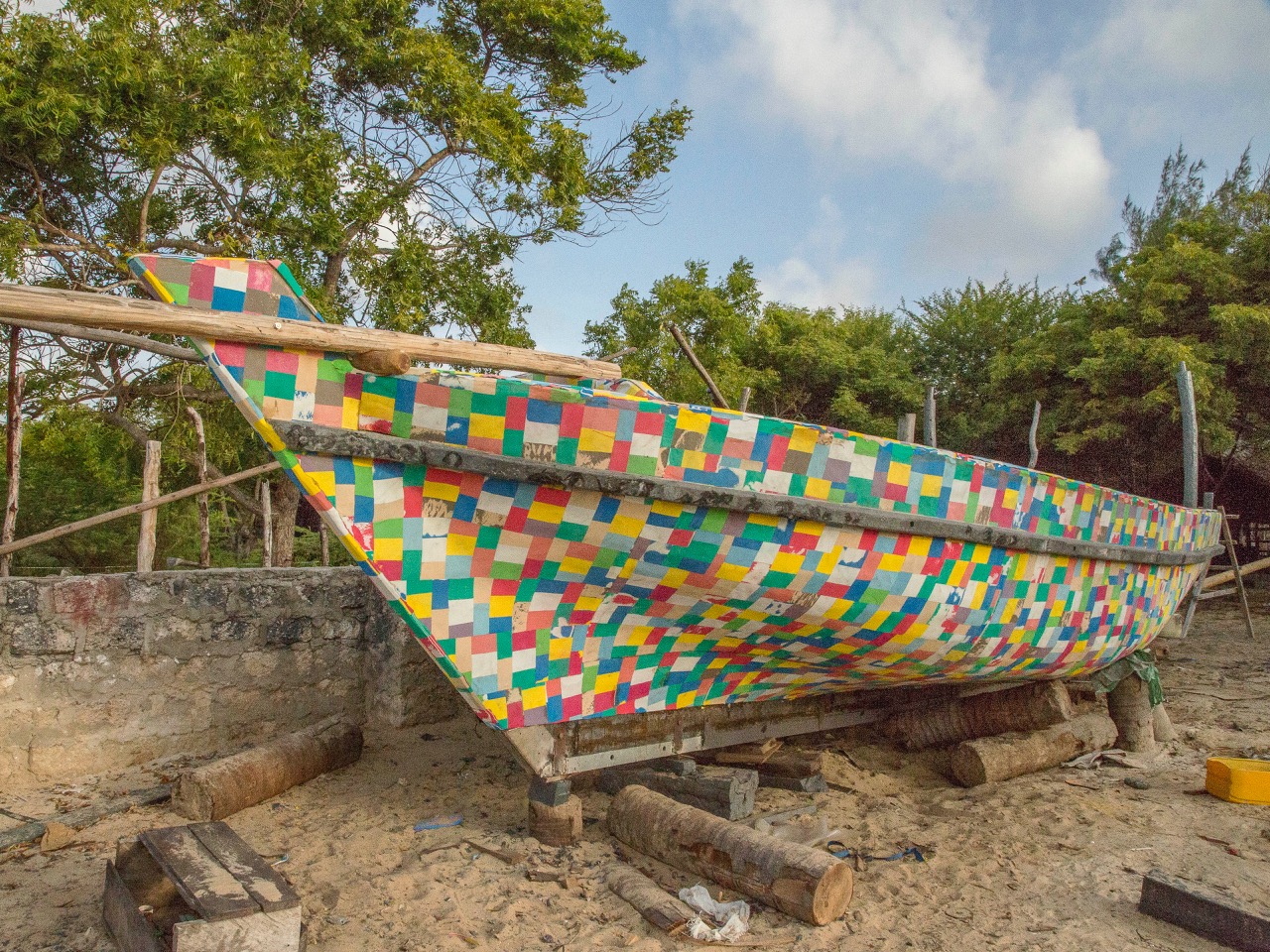So we covered the whole boat with sheets of recycled flip-flops, giving it a very colourful look and adding an extra protective layer (the whole boat feels like a big yoga mat :))