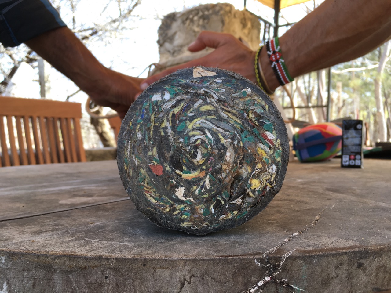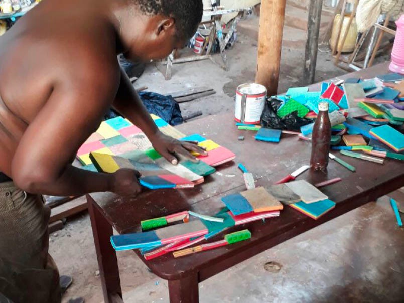 The sheets were made by local flipflop artist James who cuts the flip-flops into pieces, glues them together and sands them to an even sheet.