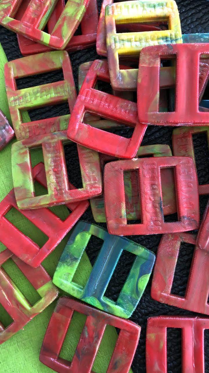With the PE bottle caps collected we make a variety of products including key rings, surf wax combs, buttons and buckles. These products are used within our company, sold to privates, or to fair trade wholesalers.