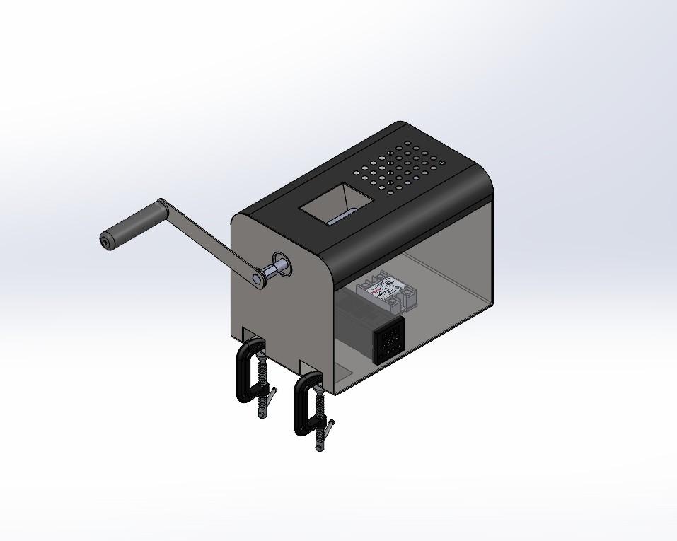 Desktop extruder for home use. It has a socket for fastening with clamps to the table. Transparent case walls allow you to see the components. Has a surface for pre-drying plastic.