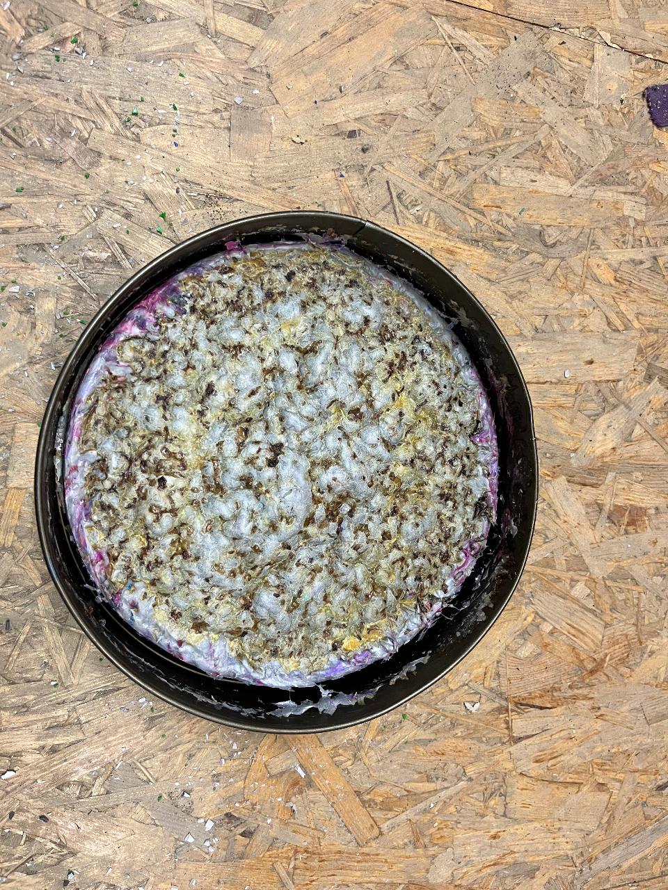 Fill the cake tin with your granulated material to the top and put it into the oven. Keep in the oven for about an hour, otherwise the inside of the seat won´t melt. Take out of the oven and let cool down for another hour. Once cooled down, open the cake tin and take out your seat.