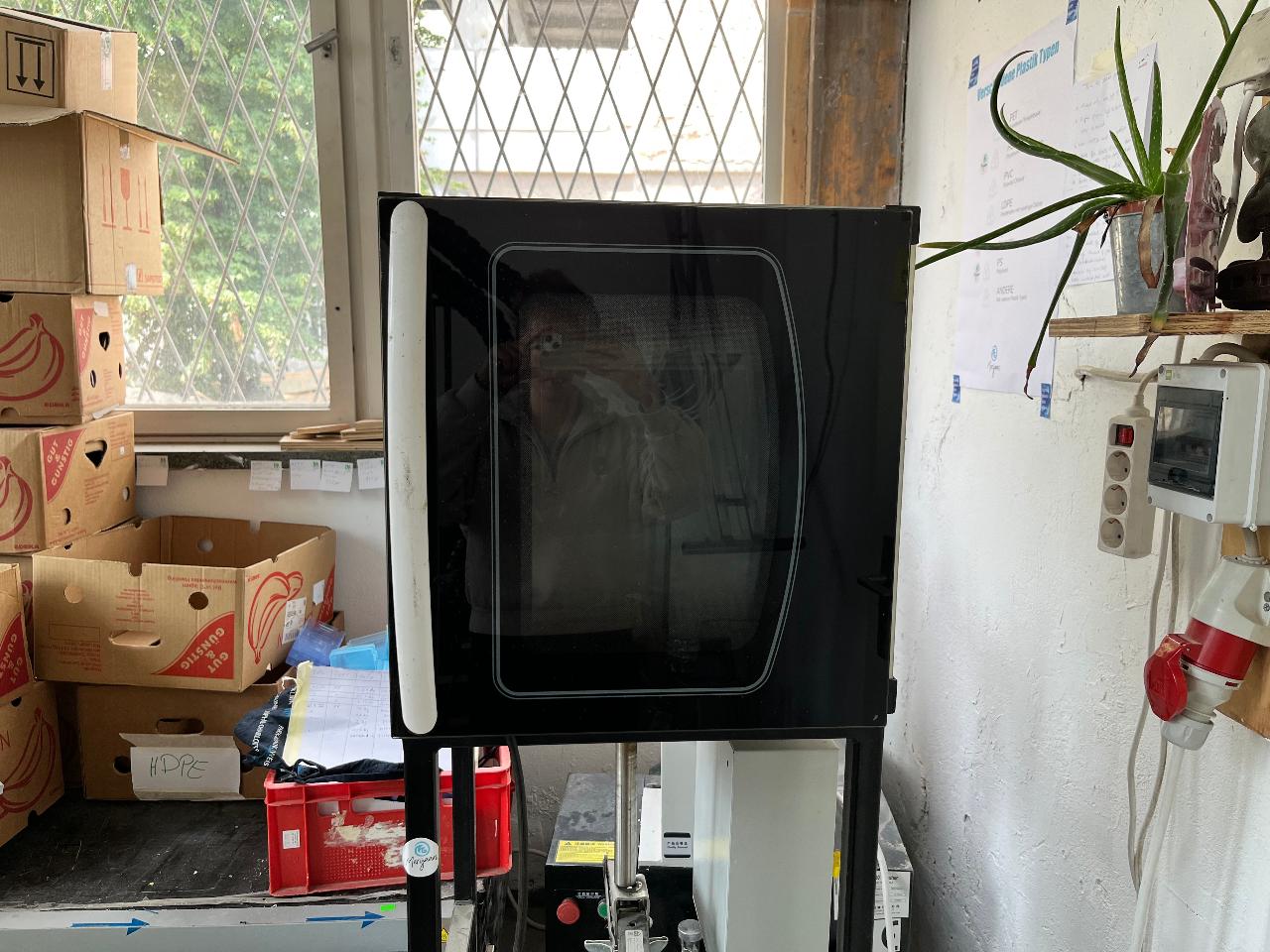 As a machine we use a small oven, converted to a compression machine. Simply put the mould in. We heat the oven up to 250° for PP.