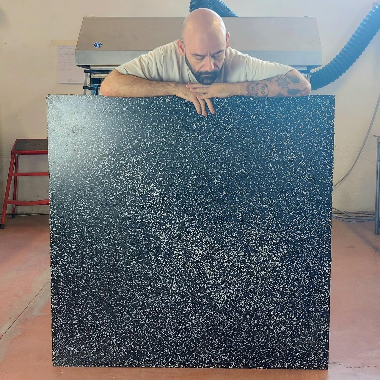 Now we place all our chopped plastic in the 1X1MT mold, we put it into the sheetpress and we create our upcycled plastic sheet