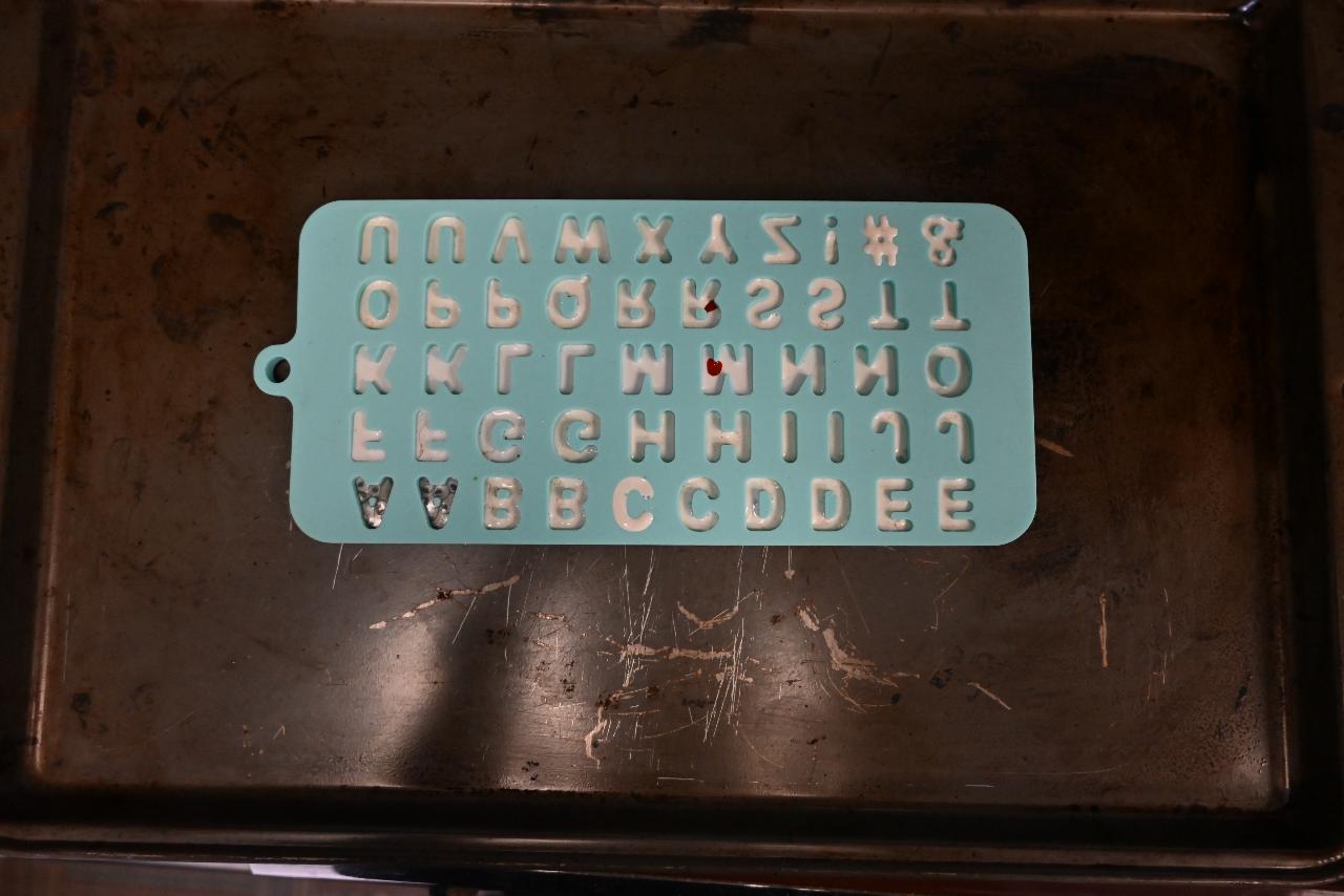 When done filling the mold with plastic, bring the cookie sheet with the mold on it to the oven. Set the oven temperature to 400°F and bake. We waited about 30 minutes for the plastic to melt, however, the oven we were using was very old so time may vary. Make sure to keep an eye on the plastic. When the plastic is melted, use oven mitts to take the cookie sheet out of the oven. Place the cookie sheet on a heat-safe surface such as the stovetop or another oven mitt. Wait for the cookie sheet to cool before moving on to the next step.