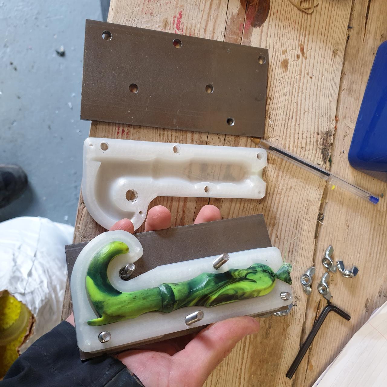 Unclamp the mould, peel the part from the mould and leave the moulds to cool (being a plastic mould, it keeps warm for longer which can cause issues over multiple injections). A fan can help this process.
