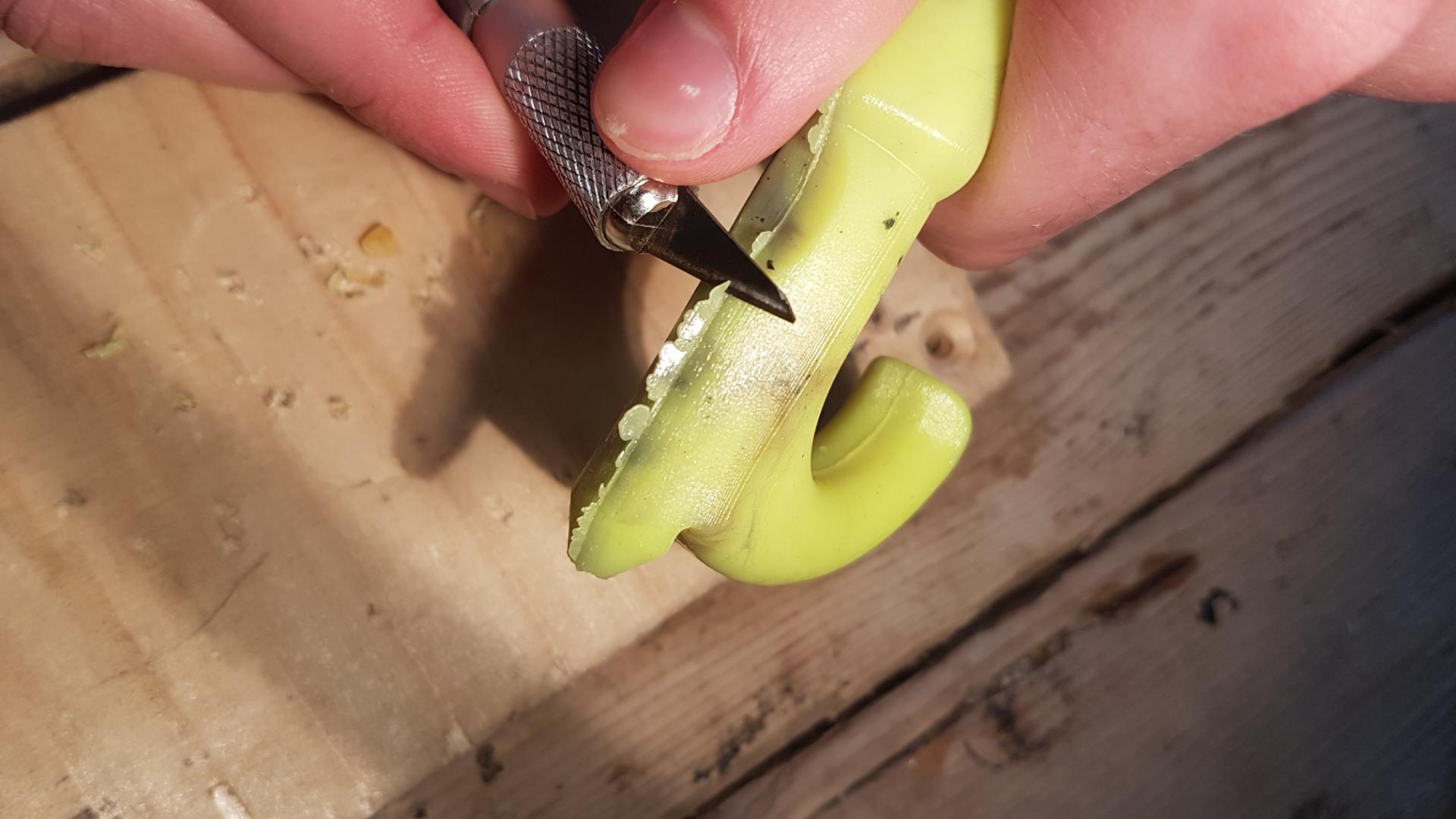 Cut away the sprue using a sharp knife. Cut away any flashing that may have occurred. Drill a hole for a keyring in the bottom. Attach a retractable lanyard which helps keep the tool keep out of pockets and reduce contamination risk but remains close to hand.
