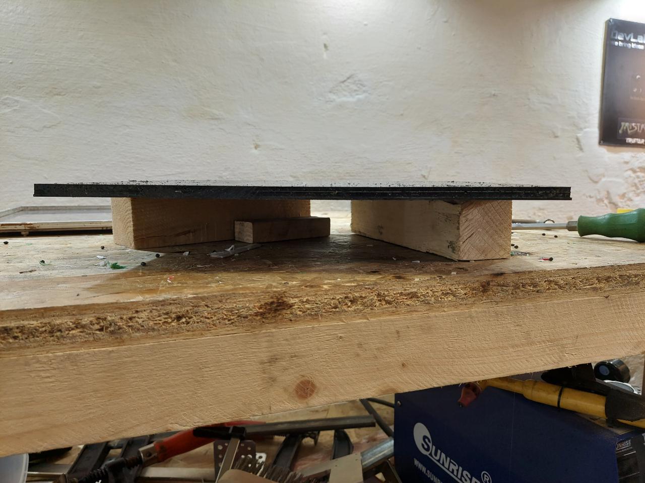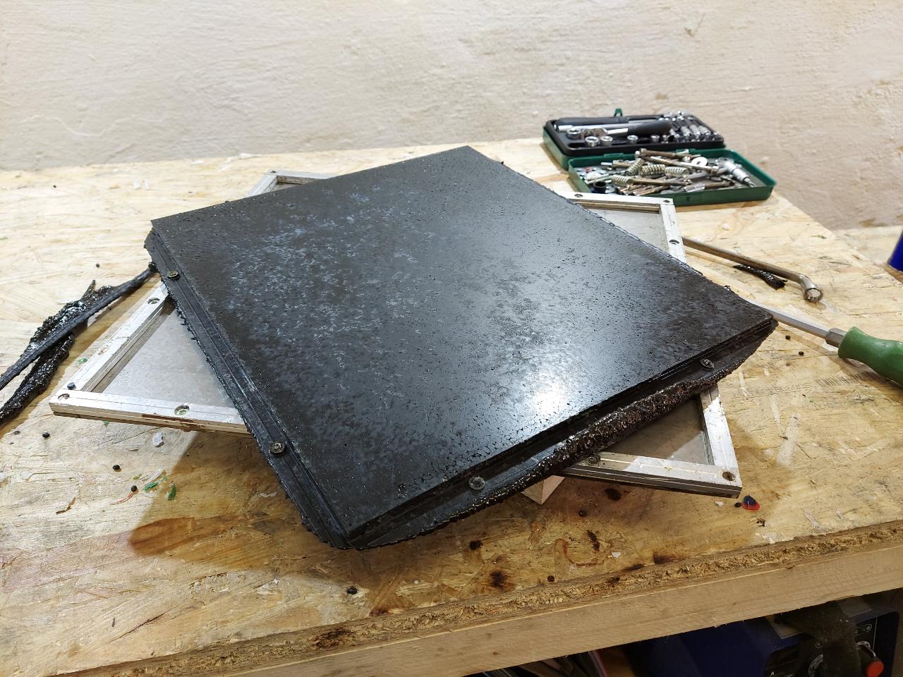 Here are some pictures of a sheet made out of ABS. If you compare it with the simplicity of the process, the outcome is really great. After cutting the edges, you will get a flat sheet with good surface. (small pellets / flakes work best)