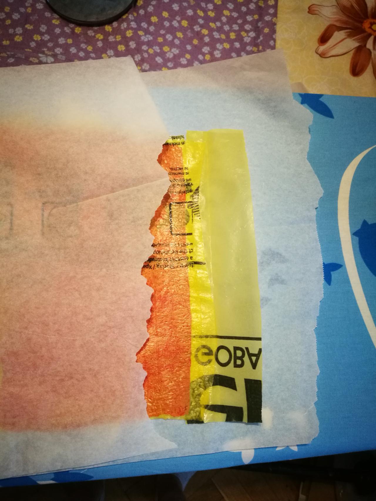 The layers of bags are then ironed at the temperature somewhere between COTTON and LINEN settings. The iron has to be always moving and not stopping on any spot for too long as it might overheat the plastic. Plastic is to be ironed until it is completely fused. The more pressure you put into ironing, the more flat will the surface of the material be. This process to be repeated until you have 3-4 layers of plastic bags to allow for material durability.