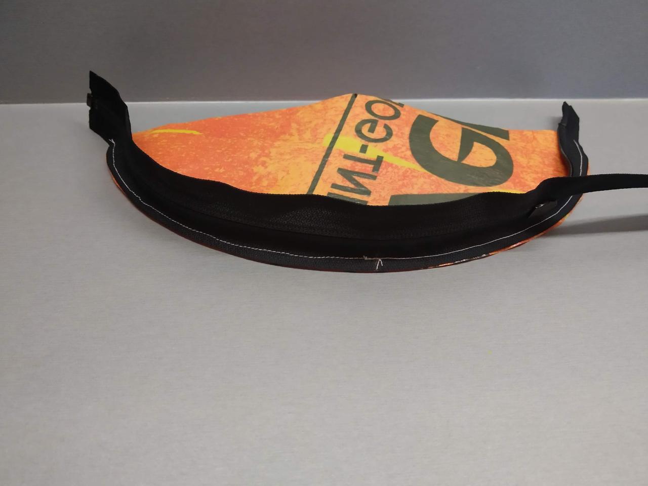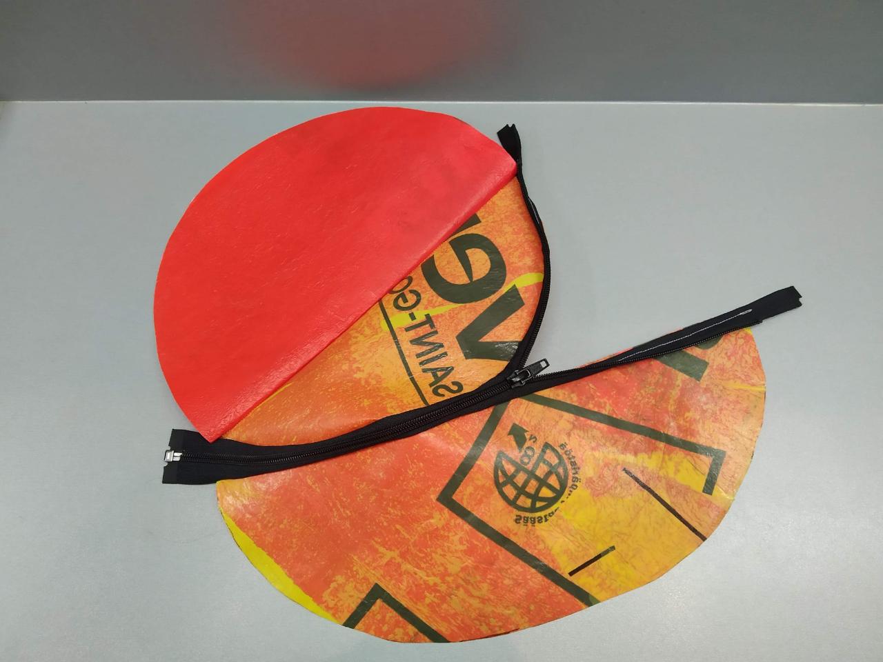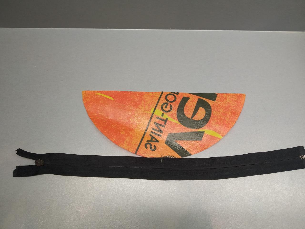 Mark the middle of the curve of the top part of the bag and arrange the middle of the zipper to align with the mark. To sew the parts, put the face of the zipper side with the side that you would want to keep as the outside of the bag together and sew them together with your favourite type of stitch.