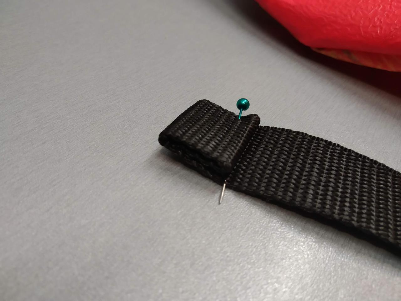 Using the sewing pins roll the strap to make the ends. Make sure to put the snap-fit buckle on the strap first!