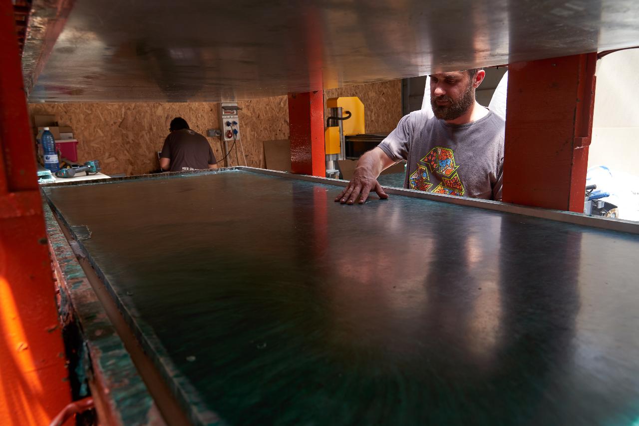 The processed marine litter and fishing nets arrive in our workshop clean and crushed, ready to be used in the heat press.