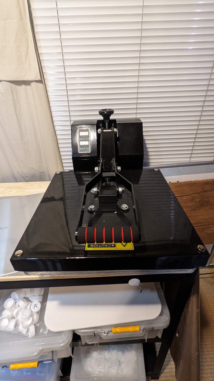 Heat press machine...commercially available heat press machine for iron-on printing. The one I am using has a 350x350(mm) heat surface. Aluminum frame...I found a supplier online that sells and processes aluminum sheet metal and placed an order. 230x300x4(mm) rectangular frame with 5mm radius on the corners. This aluminum frame is sandwiched between two aluminum sheets (2 mm) and pressed.