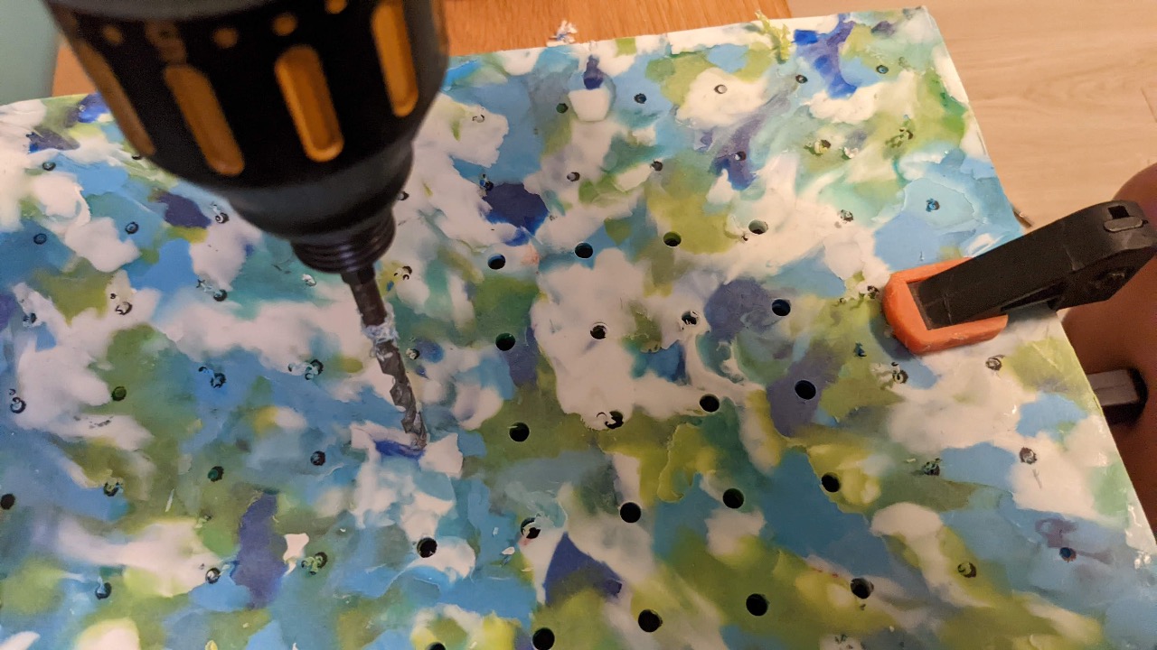 Stack the peg board on the plastic board and fix it with clamps to prevent it from moving. Aim at the center of the perforated board and drill guide holes 2 mm in diameter.