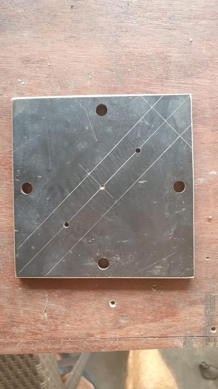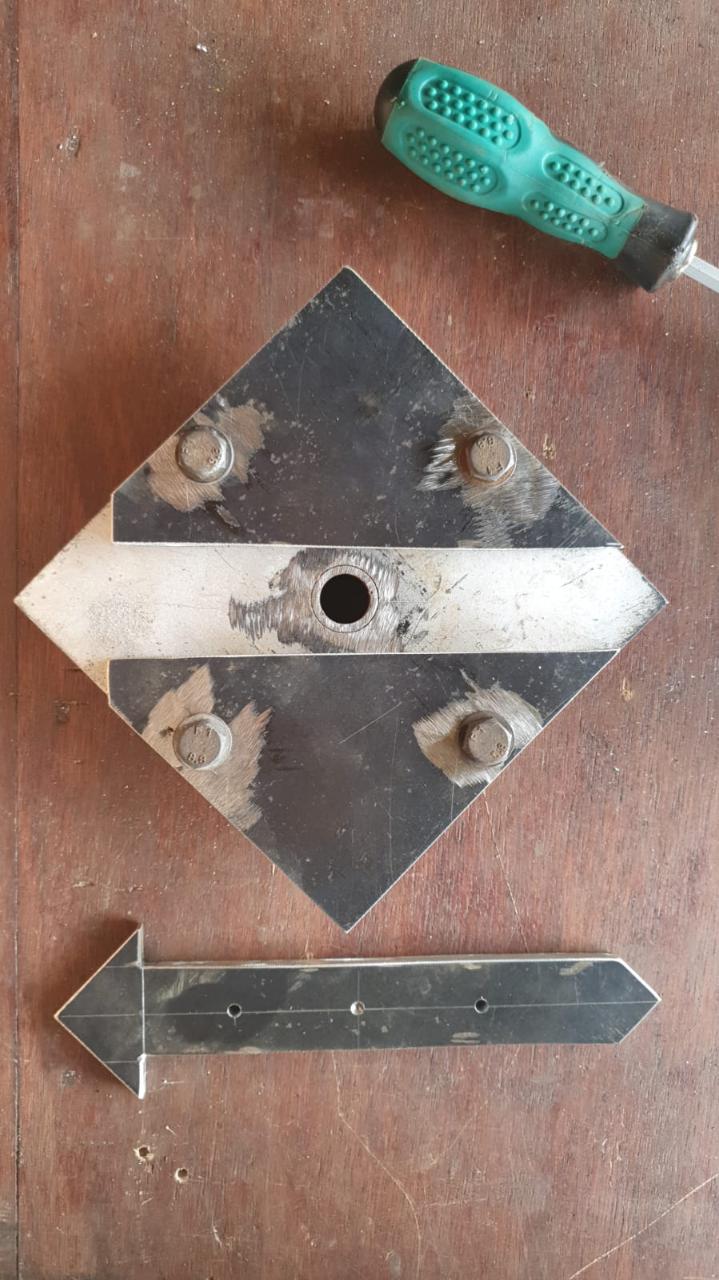 After you cut out the slide strip you can attach the 2 symmetrical parts to your nozzle plate and tag weld them to it (see pic 1). Give the arrow slide a center hole thats inline with the nozzle plate hole. This is your reference point. For us it worked best to go 4cm each way of the center point to create two holes. One 4mm close to the arrow head and the other 20mm on the other side. When the arrow slide is in its open position the 20mm and the nozzle hole are inline (See pic 3). In this position you can drill the 4mm hole all the way trough the nozzle plate. Use any kind of pin to secure the arrow slide in place so the big holes are aligned.