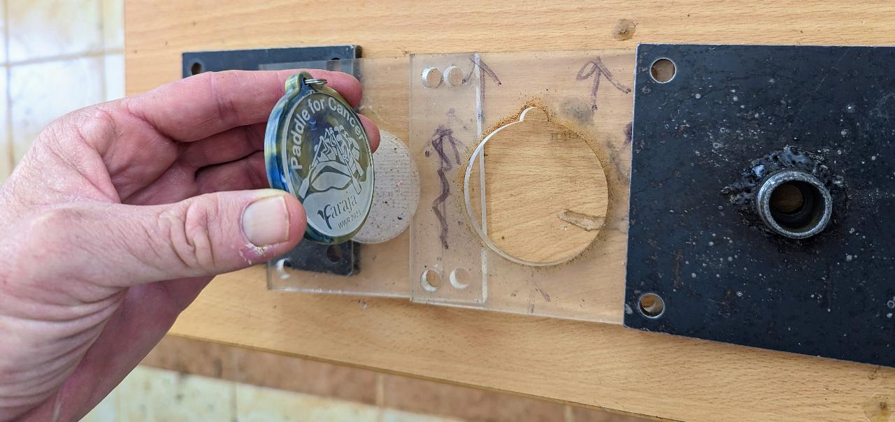 Create stylish injection molded medals with engraved acrylic inlays. In our case we used PP for the plastic and 3mm clear acrylic off-cuts.